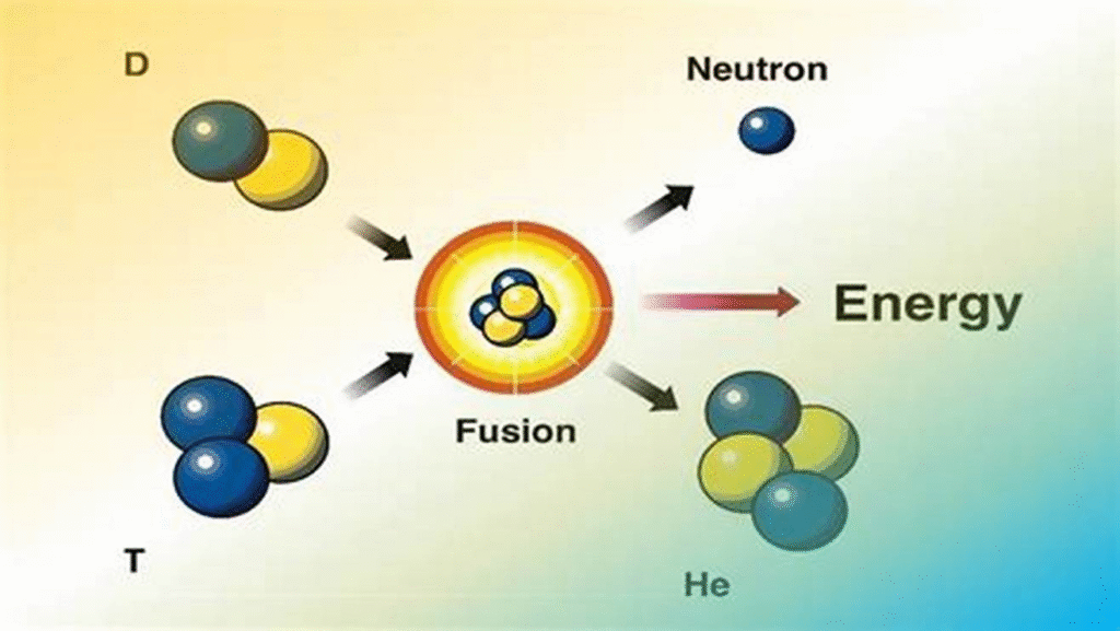 Depiction of the deuterium (D) and tritium (T) fusion reaction, which produces a helium nucleus (or alpha particle) and a high-energy neutron.
